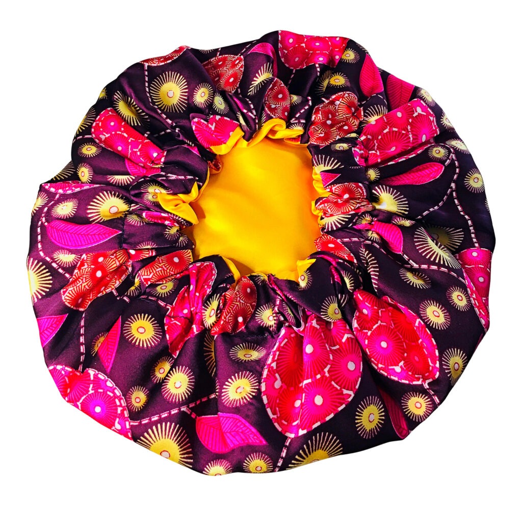 African Ankara Print Satin Bonnet Multi Color Patterns Gold/Multi