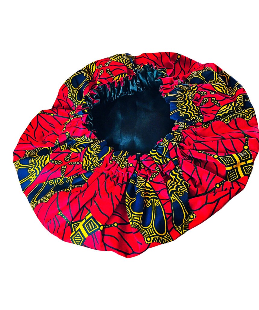 African Ankara Print Satin Bonnet Multi Color Patterns Red/Multi