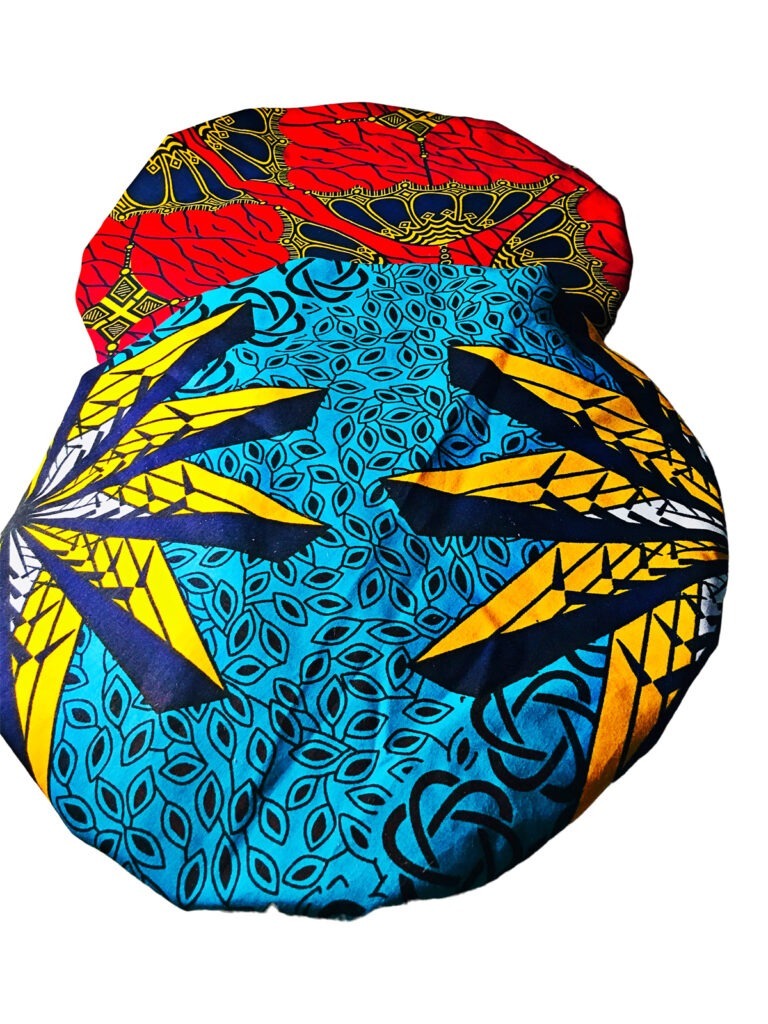 African Ankara Print Satin Bonnet Multi Color Patterns Blue/Yellow
