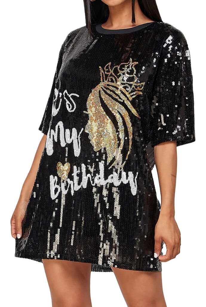 2Chique Boutique Women’s Sequin T Shirt Dress Its My Birthday with Gold Crown and Heart One Size Fits All Black