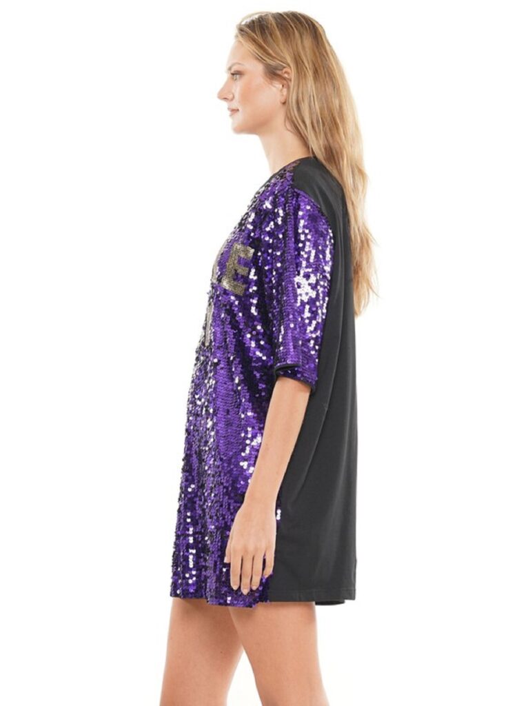 2Chique Boutique Women’s Game Day Sequin T Shirt Dress Purple and Gold Sequins on One Side