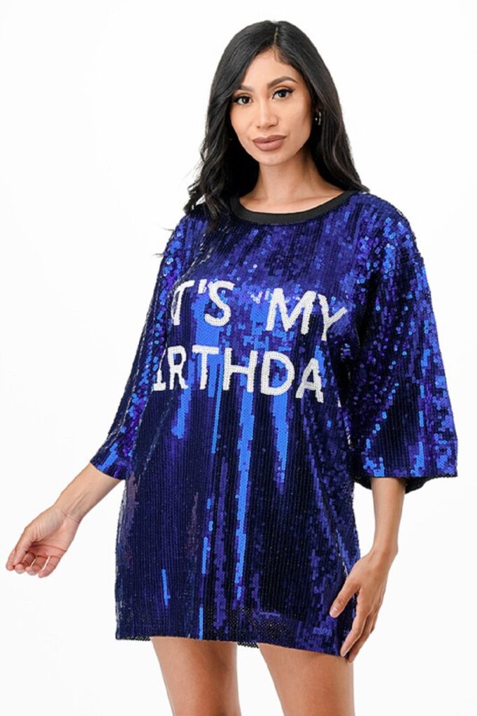 2Chique Boutique Women’s Blue Sequin T Shirt Dress It’s My Birthday One Size Mini Dress
