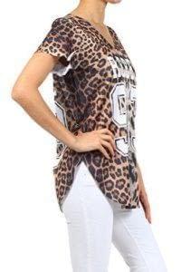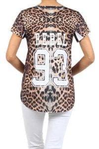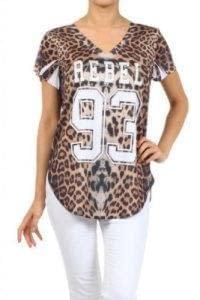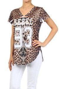 leopard print jersey knit top with laser cut outs and v neck. Top features a loose fit and slits on sides of hem. Features a number and word print graphic on the bodice