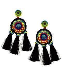Unique black thread and multi color acrylic seed bead dangle earring set Post chandelier tassel dangle Lead compliant earring set 2″ W x 4 3/8″ L Color black/ multi