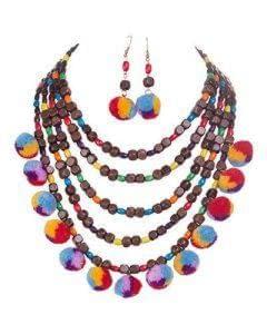 Unique thread wood fish hook earrings multi strand necklace and earring set