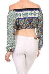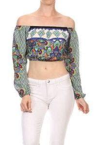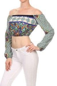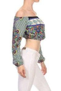 Women’s printed comfortable crop top off the shoulders long sleeves color jade and multi comfortable fir easy to wear relaxed style made in the USA great for any occasion