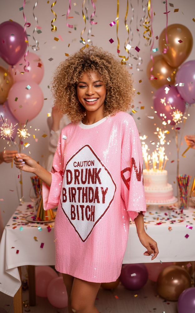2Chique Boutique Women’s Sequin T Shirt Dress Drunk Birthday, Pink