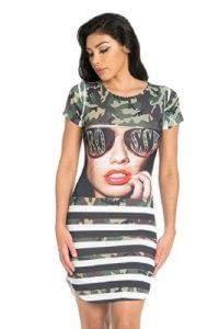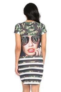 Cute Short Sleeve Printed Dress with Camo and Stripe Design