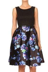 Floral print taffeta fit and flare dress great dress for all occasions beautiful floral print faux leather belt zip up closure in the back black and blue