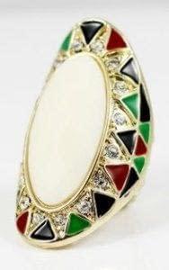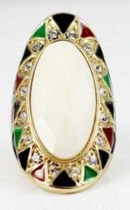 Gold Tone/ Cream Acrylic Ring/ Multi Color Design / Size: Free Stretch/ Lead and Nickel Compliant.